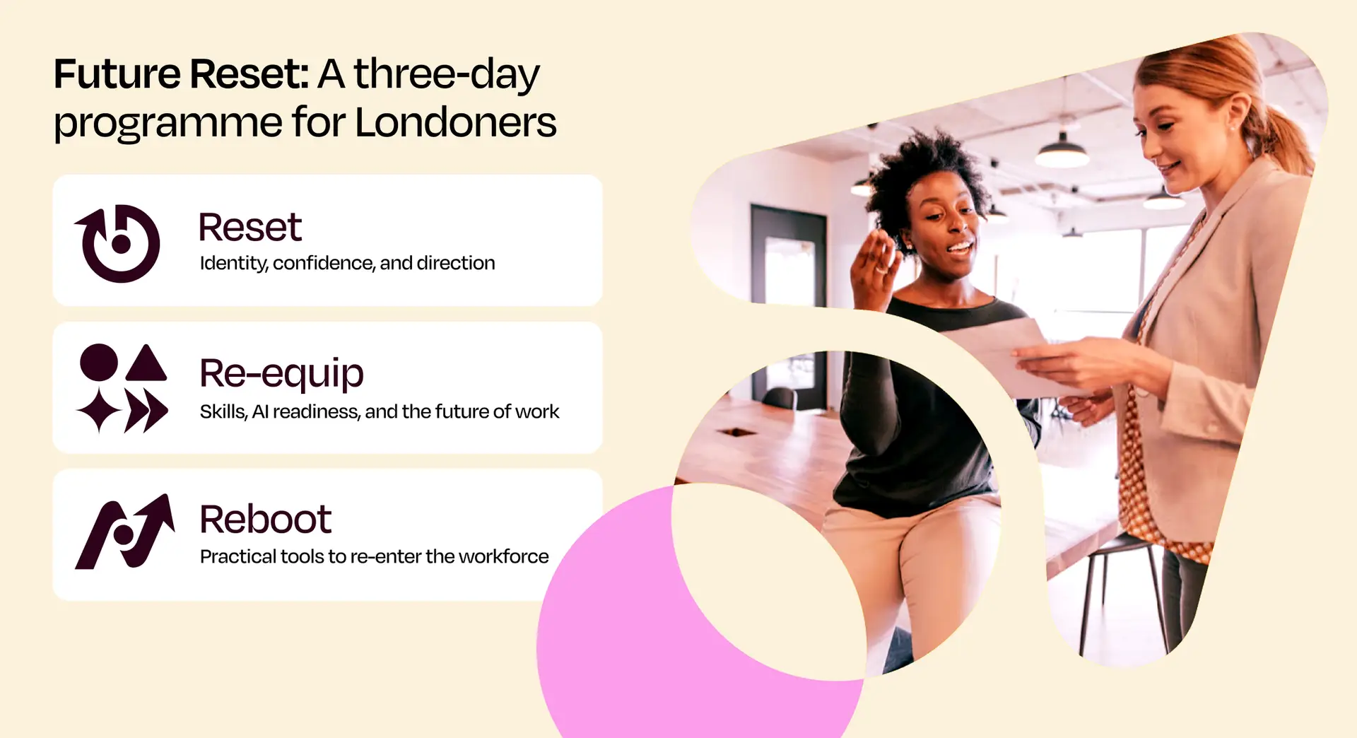 Future Reset is our flagship three‑day programme for Londoners who have recently been made redundant from roles paying £28k–£67k.